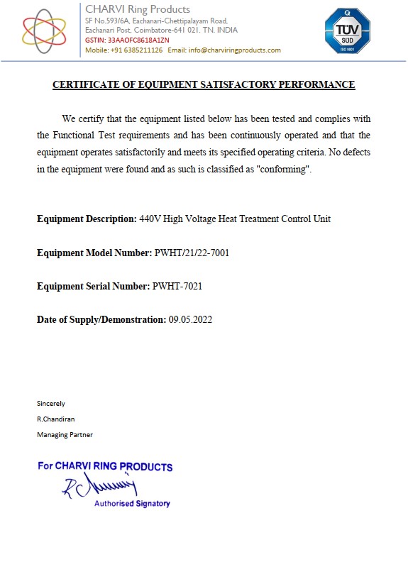 CERTIFICATE OF EQUIPMENT SATISFACTORY FROM-CHARVI RING PRODUCTS.