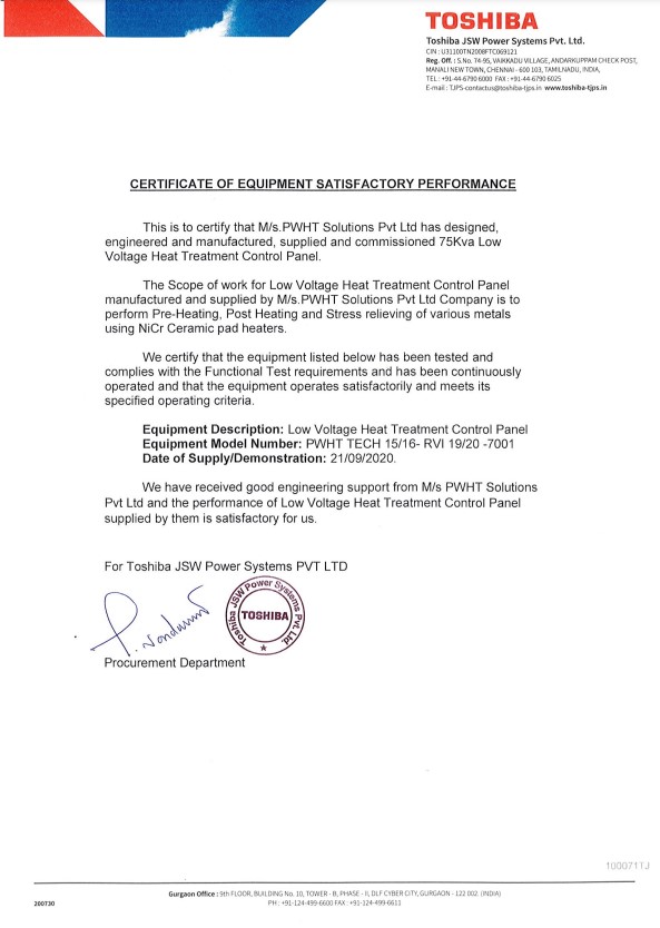 CERTIFICATE OF EQUIPMENT SATISFACTORY FROM- TOSHIBA JSW POWER SYSTEMS INDIA.