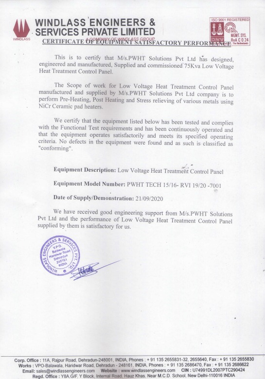 CERTIFICATE OF EQUIPMENT SATISFACTORY FROM- WINDLASS ENGINEERS INDIA