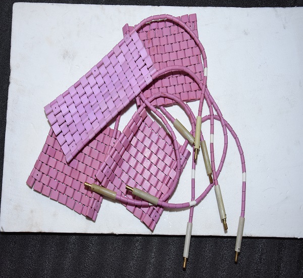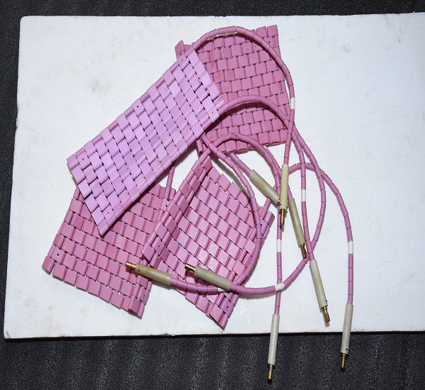 The ceramic pad is manufactured from high alumina ceramic beads with a nickel-chromium flexible core wire serpentined within the beads. Nickel tails are weld to the core wire.